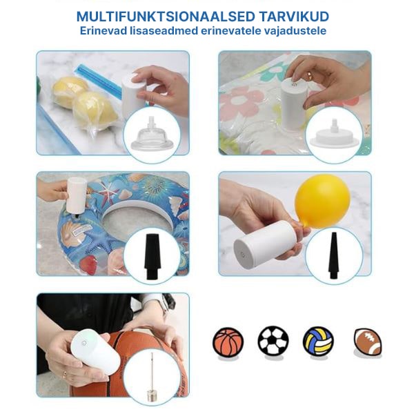 🎈 Kahekordistub õhupumbana – Täidab ka hoiukotid, õhupallid ja palju muud.