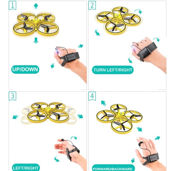 1. Tõus ja laskumine: Vajutage sõrmega nuppu. Droon reguleerib kõrgust vastavalt käe kõrguse muutusele.