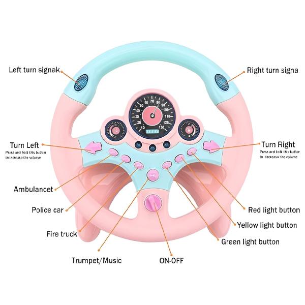 See lÔbusate helide, vilkuvate tulede ja kergesti vajutatavate nuppudega disainitud rooliratas köidab noori autojuhte ja paneb nad fantaasiarikkasse mÀngu.