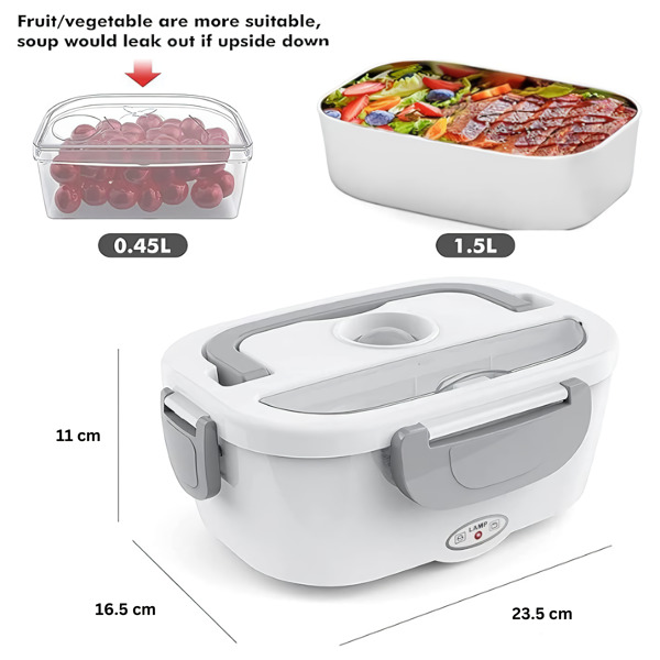 See soojendatav lõunasöögikonteiner sisaldab kahte eemaldatavat 1,5 l mahutit ja 0,45 l plastmassist mahutit, mida saab kasutada vaheldumisi.