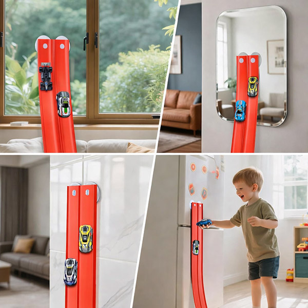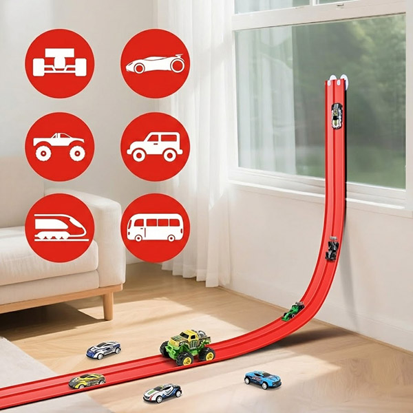 Imikuppidega kinnitus võimaldab lastel ja vanematel kiiresti nurki ja paigutusi muuta, nii et rada saab korduvalt ümber ehitada ilma tööriistade või keerulise seadistuseta.